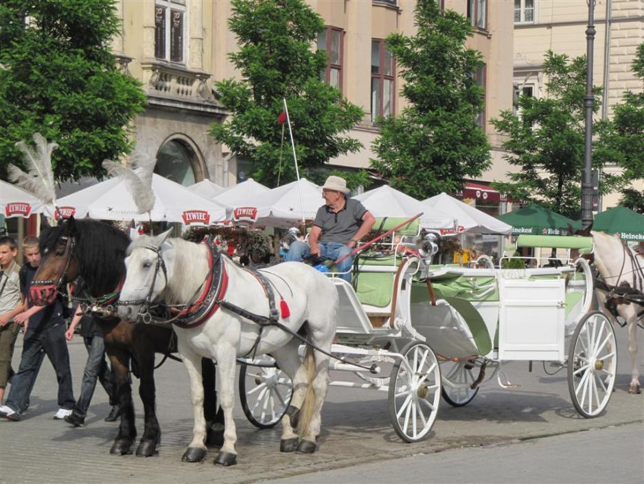 Når mørket faller på endres hele atmosfæren på markedsplassen. Alle er ute. Alle er glade. Samtlige kafeer og fortausrestauranter fylles opp av glade og opplevelseslystne turister og fastboende. Det hele blandes med nonner og munker, som stille tasser over markedsplassen, mens hestene pruster og venter på sin neste tur.Det er spisesteder i alle prisklasser og med forskjellige temaer. Prøv evt. polske spesialiteter – det minner om gammeldags husmannskost, så man blir helt sikker mett. Prisnivået er omtrent som hjemme.