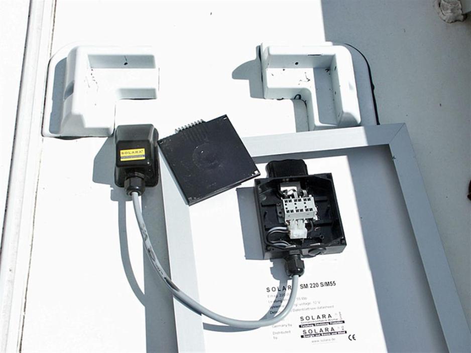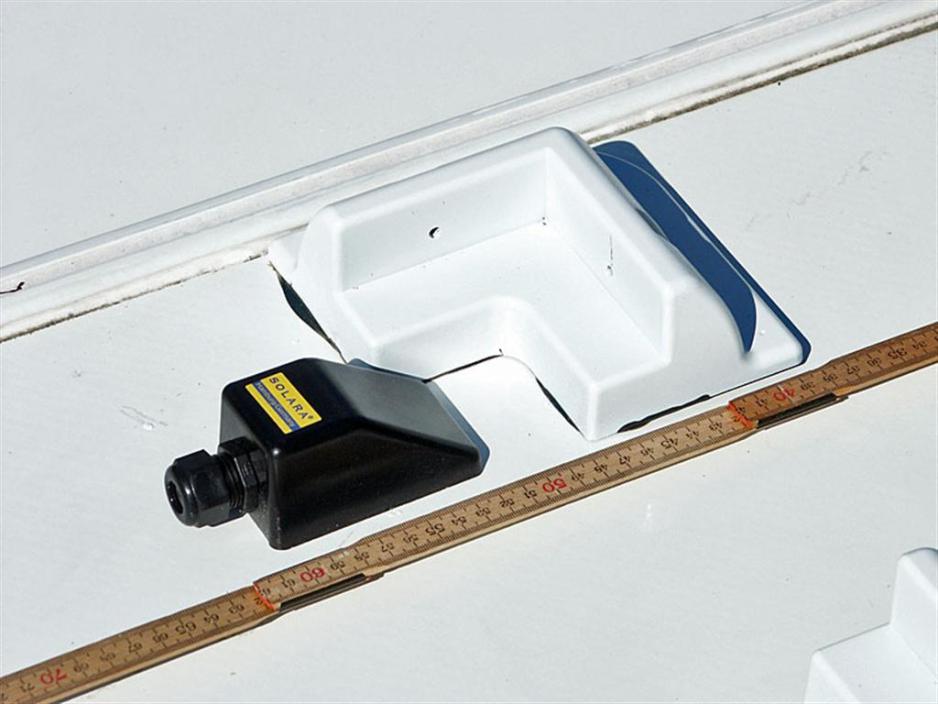 Dra opp kabelen gjennom taket og gjennom kabelgjennomføringen, før du limer denne på plass. Koble til kabelen i koblingsboksen på panelets bakside. Deretter kan du skru fast panelet og koble kabelen til 12 V-systemet.