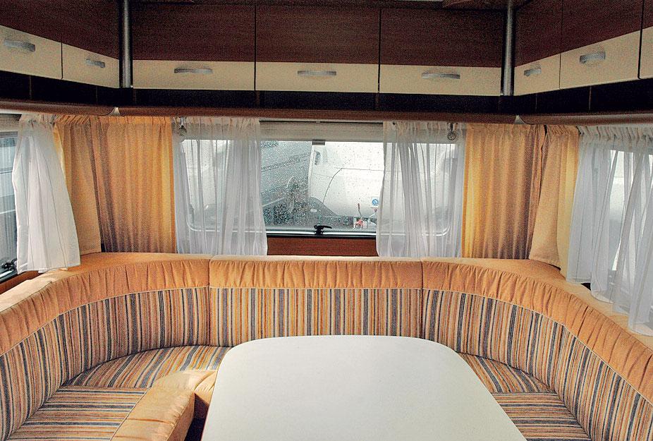 Sittegruppa hadde helt klart høyeste prioritet da vognarealet ble fordelt. Her er det god sitteplass til minst åtte personer og sittekomforten er svært god. Rundsittegruppa er plassert helt fremst i vogna. Det store avlange bordet med avrundete hjørner måler hele 118 gange 80 centimeter. Hele veien over sittegruppa er det plassert overskap. Hele ni i tallet. Høyden på skapene er 32 centimeter, de er 53 brede og har en dybde på 30 centimeter. Under hele overskapsrekka er det ei lita åpen hylle. Belysningen består av ei krone i taket samt spotter i hjørnene i tak og under overskapet. Over bordet er det plassert ei lita takluke. Mellom vinduet i frontveggen og putene i sittegruppa er det ei stor åpen hylle.
