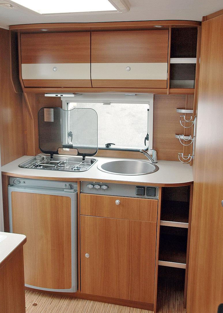 Plassert helt bakerst i vogna. Benkeplata er 136 centimeter bred og 64 centimeter dyp. Arbeidshøyden er på greie 94 centimeter. Helt til venstre er det et nedfelt Thetford Spinflo gassbluss med plass til tre relativt store kjeler samtidig. Glassplate til å dekke blussene når de ikke er i bruk er på plass. Til høyre er det nedfelt oppvaskkum i metall. På veggen til høyre er det montert tre flaskeholdere. Under gassblusset er finner du kjøleskapet. Et 107 liters Thetford skap med fast frysedel. Under oppvaskkummen finner vi først en bestikkskuff. Denne er 47 centimeter bred, 13 høy og 37 centimeter dyp. Under bestikkskuffen er det plassert et skap, som er 68 centimeter høyt, 57 dypt og 54 centimeter bredt. Skapet er delt i to med ei hylle og i døra er det montert ei søppelbøtte. Kjøkkenet har to overskap. Disse er 42 centimeter høye, 27 dype og 52 centimeter brede. Skapene er delt i to. slik at det blir to smale hyller på ti centimeter nederst og to store 32 centimeter øverst. Helt til høyre er det ei åpen hylle som er delt i to. Samme dybde og høyde som overskapene. Bredden er 18 centimeter. Tre spotter plassert under overskapene, vindu mellom overskap og kjøkkenbenken samt ei stor takluke gir greit lys for kokken. Kjøkkenet er også utstyrt med ei overtrekksvifte.