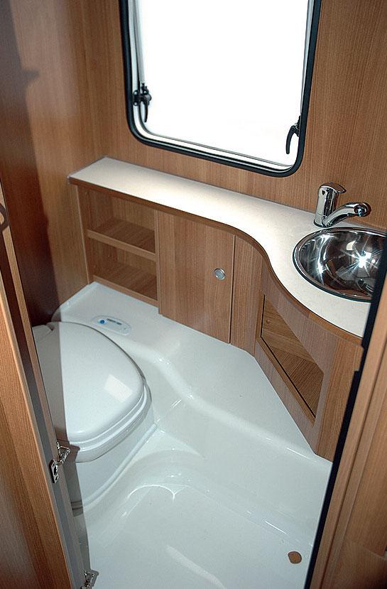 Badet er plassert ved siden av kjøkkenet. Til venstre er det montert et vendbart Thetford kassettoalett. I motsatt hjørne finner vi servanten, som er i samme materiale som oppvaskkummen i kjøkkenet. På sideveggen er det vindu og sanitærrommet har egen takluke. To spotter over servanten utgjør belysningen. Dette badet har relativt god skapplass. Over vinduet er det plassert et lite skap, som er 41 centimeter høyt, 30 bredt og 14 centimeter dypt. Skapet er delt i to. På endeveggen er det to åpne hjørnehyller, mens det under vinduet er et skap som går fra hjørne til hjørne og består av to åpne hyller helt til venstre. Videre følger et lite skap og det hele avsluttes av servanten med ei stor åpen hylle under. I døra er det montert håndkleholdere. Vogna er utstyr med dusjgulv, men dusjing er verken tilrådelig på grunn av at hyller og skap ikke er beskyttet mot fukt. Dusjing er heller ikke mulig da armaturen i servanten ikke har lang slange og er fastmontert. Konklusjonen er et sanitærrom som har det meste en trenger, bortsett fra muligheten for en dusj.