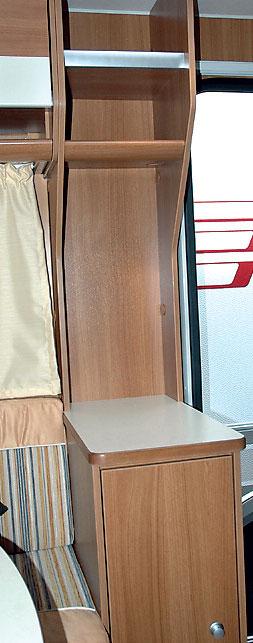 I tillegg til lagerplass beskrevet under sittegruppe og kjøkken er det godt med lagerplass i vogna. Et garderodeskap er plassert mellom sittegruppa og badet. Dette er 141 centimeter høyt, 60 dypt og 56 centimeter bredt. Hengehøyden på 126 centimeter. Under skapet er Trumatic varmeanlegget plassert. Mellom sittegruppa og inngangsdøra finner vi et skap som går fra gulv til tak. Nederst er det et skap som er 82 centimeter høyt, 53 dypt og 29 centimeter bredt. Oppå dette skapet er det ei bordplate. Overdelen av skapet består av to åpne hyller. I tillegg er det noe lagerplass i den integrerte gasskassa. Selv etter at alt standardutstyret er på plass.