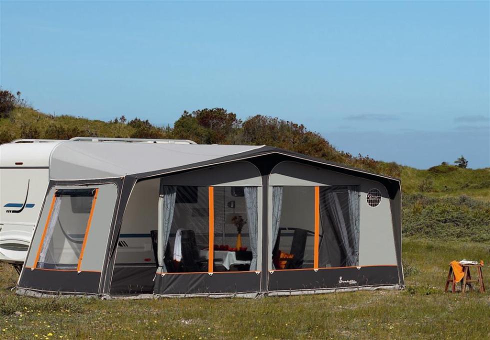 Det har myggnettsvindu i begge gavlene med ventilasjonsmuligheter og dekkfolie noe som kan komme vel med under varmere sommerdager. Teltduken er belagt med et materiale som gjør det lett å holde rent.Fire dører gir maksimale muligheter til møblering og frihet og teltet dekker hele vognen. Front og gavler har avtagbare og nedfellbare deler og bakkekappe innvendig.Gardiner i mønsteret 'Bowline Grey' medfølger. Du kan velge mellom glassfiber- og stålstativ og som ekstra utstyr finnes utbygning, frontsoltak og takrenne.