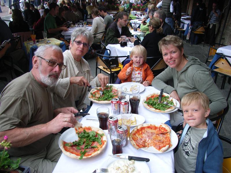Når vi kommer tilbake til campingplassen trenger vi bare å hvile bena og få litt god mat. Heldigvis har vi proviantert i en av Sienas mange spesialforretninger. Maten er ikke billig, men ualminnelig lekker og vi sitter ved bordet i mange timer, mens Mie og Mathias leker rundt oss. Det er hyggelig og veldig avslappende. Selv om vi selv skal gjøre i stand og vaske opp, er det mye mer meg enn å skulle sitte på hotell med to små energiske barn. Og så er det i tillegg ikke langt til sengen, hvis man får lyst på et ekstra glass god rødvin…
