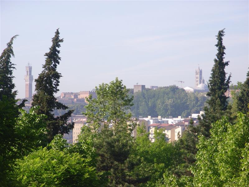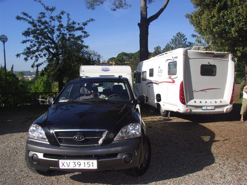 Vi finner en campingplass et par kilometer fra sentrum av Siena. Utsikten er helt perfekt, fordi vi gjennom pinjetrærne kan se byens gamle middelaldertårn. Hele campingplassen er inndelt i terrasser og vi velger en plass helt oppe på toppen. Plassen har de fasiliteter man har bruk for og standarden er middels. Men, det er ikke så veldig god plass. Oppstillingsplassene er små og veiene på plassen er smale. Plassen, som ligger i en fjellskråning, har en veldig bratt bakke til og fra hovedveien (ca. 8 %).