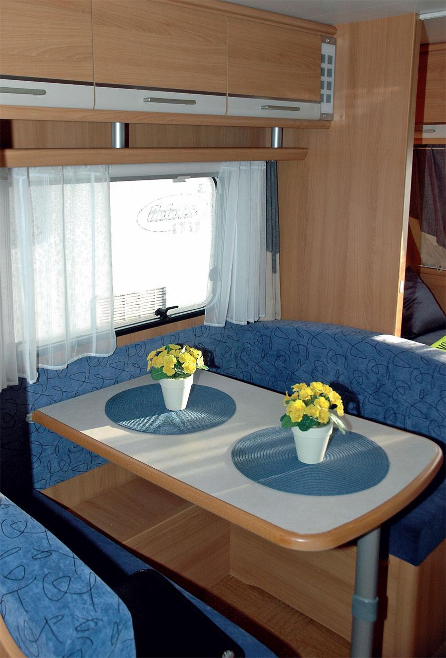 Kjøkkenet er plassert helt bakerst i vogna. Benkeplate måler 120 centimeter bred og 58 dyp. Nedfelt Smew til høyre mot deleveggen til badet og et gassbluss med tre bluss fra samme leverandør i midten. Begge er i rustfritt stål og kan dekkes til med hver sin glassplate. Helt til venstre på benken er det noe avlastningsplass. Med to kokker i sving kan det være vanskelig å ikke være i veien for hverandre.Til høyre på deleveggen mot badet er det blitt plass til ei krydderhylle. Overskapsrekka består av to overskap som begge er 60 centimeter brede, 26 dype og har en innvendig høyde på 36 centimeter. Et av disse to skapene er delt i to av ei hylle. Under gassblusset har kjøleskapet fra Dometic funnet sin plass.Bruttovolumet er på 93 liter og har fast frysedel øverst. Til høyre for kjøleskapet er skufferekka som består av tre skuffer. Samtlige er 33 centimeter brede og 44 dype. Øverst befinner bestikkskuffen seg. Denne er seks centimeter høy. Skuff nummer to er 34 centimeter høy, mens den i bunnen har en høyde på 19 centimeter.Et lyspunkt under overskapet, ei lita takluke og vindu mellom overskapet og benkeplata gir tålig med lys for kokken. Kjøkkenet har ikke avtrekksvifte eller plass for søppelbøtte.