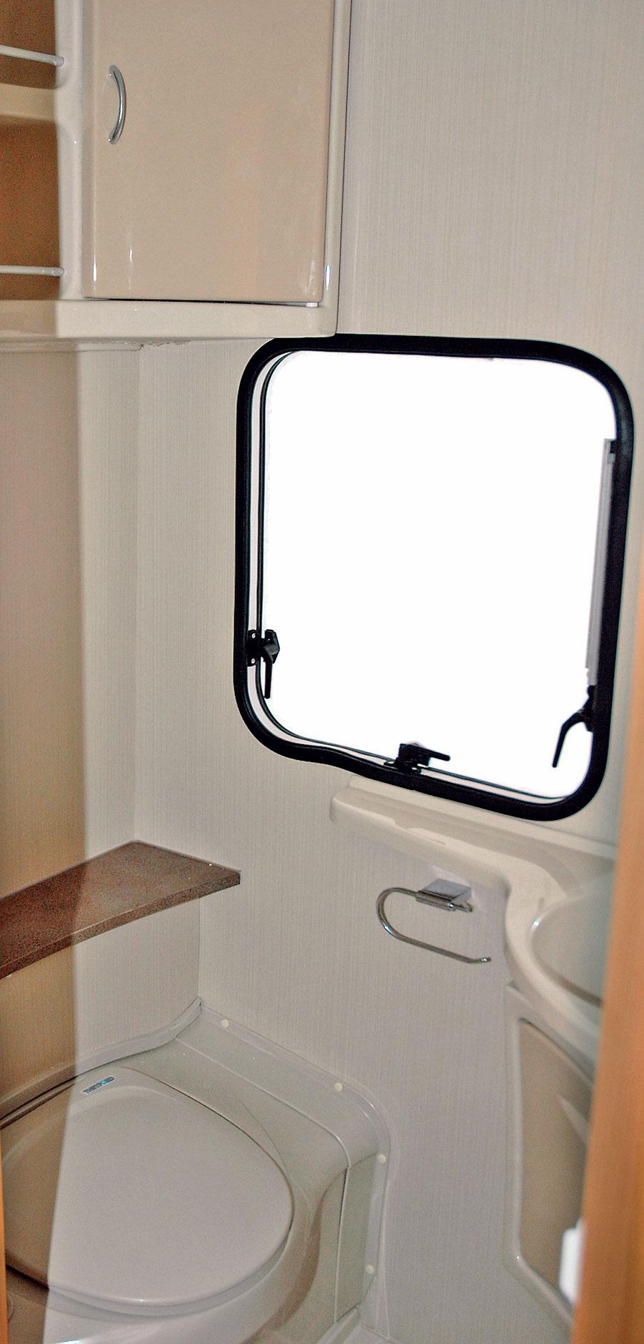 I tillegg til den lagerplassen som er beskrevet under vognas andre kapitler er det funnet plass til et hengeskap. Dette er plassert midt i vogna, tvers ovenfor sittegruppa. Skapet er 140 centimeter høyt, 39 dypt og 48 centimeter bredt. Hengehøyden er på 133 centimeter. Under dette skapet er Trumatics varmluft plassert. På høyre side av dette skapet er det ei stor åpen hylle øverst. Under dette TV-bordet er det et underskap med noe lagerplass. I den integrerte gasskassa er ikke mer plass igjen når reservehjul, to gassflasker og spillvannstanken er på plass. Reservehjul og trillbar spillvannstank på 30 liter er standard utrustning. Totalt sett er det godkjent med lagerplass for to stykker i vogna, særlig med tanke på at vogna er ei ni-måneders-vogn. For bruk i streng kulde med de behov det medfører av ekstra utstyr er det ikke nok lagerplass. Heller ikke om en skal ha med seg to barn. Mener derfor at det totalt sett er det godkjent med lagerplass for to stykker i vogna, men heller ikke mer.Bad:Badet er plassert ved siden av kjøkkenet helt bakerst i vogna. Dette er utstyrt med dusjgulv. Håndvaskarmaturet har lang slange og det er plassert et feste for dette høyt opp for veggen. Dusjing går greit i denne vogna. Håndvasken er plassert i hjørnet med det samme du kommer inn i rommet. Over denne er det et stor hjørnespeil, under et skap med typisk plass til en stabel med håndklær. Til høyre for vasken mot inngangsdøra er det satt opp en håndkle holder. Mot bakveggen i vogna er det et Thetford kasettoalett. Over toalettet et skap med plass til det mest nødvendige for den faglige kroppspleie. På sideveggen er det et ugjennomsiktig vindu som slipper inn lys og som kan åpnes for full utlufting. I taket er det en lufteventil. Det er et lyspunkt i rommet og dette befinner seg i hjørnet over håndvasken. Det er ikke uttak for 220 volt i badet, så batteridrevet barbermaskin eller barberhøvel er et must.
