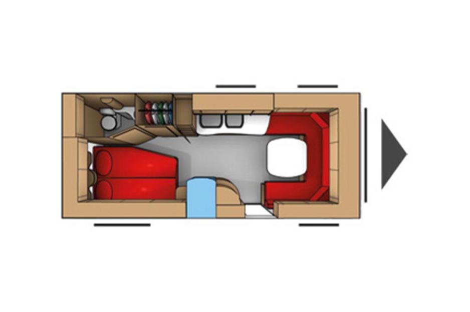 Selve planløsningen er ikke så veldig spesiell, men det er en veldig populær innredning, som passer de fleste i den målgruppen, som velger en campingvogn, som denne. Den er ideell til to personer, som ønsker god plass. Får man besøk eller har med barnebarna kan bordet i stuen slås ned, så man får en ekstra seng. Men, ikke en man sover spesielt godt på. Bakerst i campingvognen er det et soveværelse som består av en stor dobbeltseng med luksusmadrasser, garderobeskap og badeværelse. I midten har man det store kjøkkenet og i fronten er det stue. Det er først og fremst mye gulvplass midt i vognen, slik at man med letthet kan passere hverandre. Oppbevaringsplass finnes i store mengder, og det store garderobeskapet fungerer også som tørkeskap. Under dobbeltsengen er det et stort rom for oppbevaring av campingmøbler og fortelt. Det kan også nås utenfra via en serviceluke, som man godt kunne ha ønsket seg bredere, slik at det ble lettere å få tingene ut.