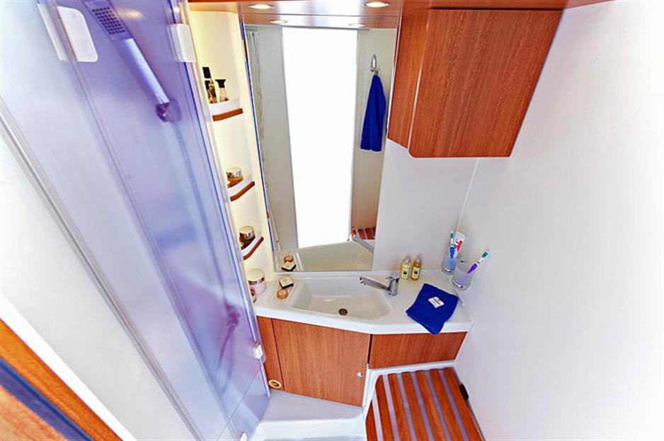 Baderommet er modernisert, og bidrar til den luftige følelsen i bilens bakre del. Her finnes godt om plass når det er tid for å dusje og kassettoalettet av benkemodell kan også, takket være et tresete, brukes som sitteplass i dusjen.Kastanjefargede møbelsnekkerier med bronsefargede detaljer gir en trivelig følelse i soverom og oppholdsrom, mens kjøkkenet har elfenbensfargede skapdører.Kaldskummadrass med syv komfortsoner, oppå en stødig ribbebunn, sørger for høy sovekomfort, og ved hodeenden finnes praktiske oppbevaringslommer til for eksempel lesestoff og briller.