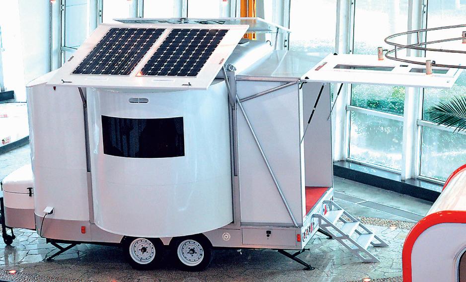 Her har man tenkt langt utenfor A4-malen. Tak og vegger vippes opp og ut når man har parkert vogna, og vips er den lille vogna blitt stor og funksjonell