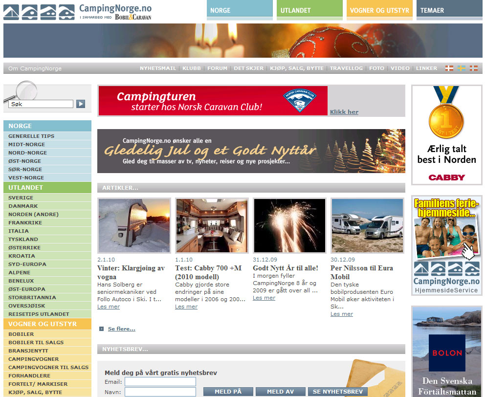 www.campingnorway.com www.campingnorge.no Am 1sten Januar 2002 haben Anne-Vibeke Isaksen CampingNorway.com gestartet in Zusammenarbeit mit den norwegischen Camping-Vereinigungen, wie zum Beispiel RBL (Campsites), NAF (Campsites), Norwegian Caravan Club und NCB (Camping branche). Heutzutage ist CampingNorway.com das meist umfassende camping Medium im Internet. Die Website ist in norwegischer Sprache und dessen Inhalt ist spezial gemeint für die norwegischen Camper. Das machen, jährlich gesehen, schon etwa 2.500 Besucher am Tag.