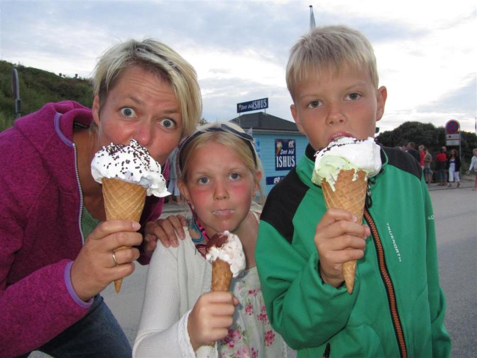 Tversted Strand er også kjent for stedet, der man finner Det Blå Ishus. Kanskje Danmarks mest kjente ishus, fordi de kanskje har Danmarks beste is. Hver eneste kveld er det lange køer av forventningsfulle turister, som vil avslutte dagen med en kaloribombe av format og vi er på ingen måte noe unntak. Vi venter med glede og jeg kan bare si at isen er verdt å vente på. Perfekt avslutning på dagen.
