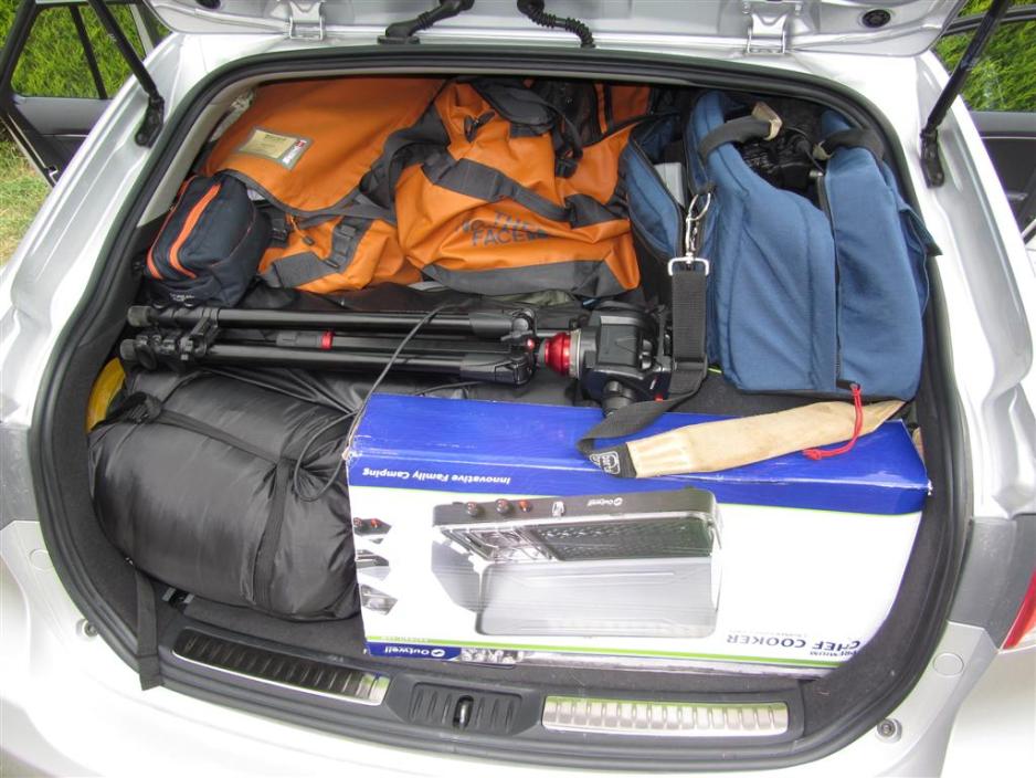 Bilen er helt fylt med bagasje og campingutstyr og det er ganske imponerende at alle våre ting kan få plass i bagasjerommet. Vi har fire sportsbager med tøy og private eiendeler. Av campingutstyr har vi med telt, luftmadrasser, fire soveposer og campingmøbler. Vi pleier også alltid å ha med grill, men ikke på denne turen. Det var ganske enkelt ikke plass.
