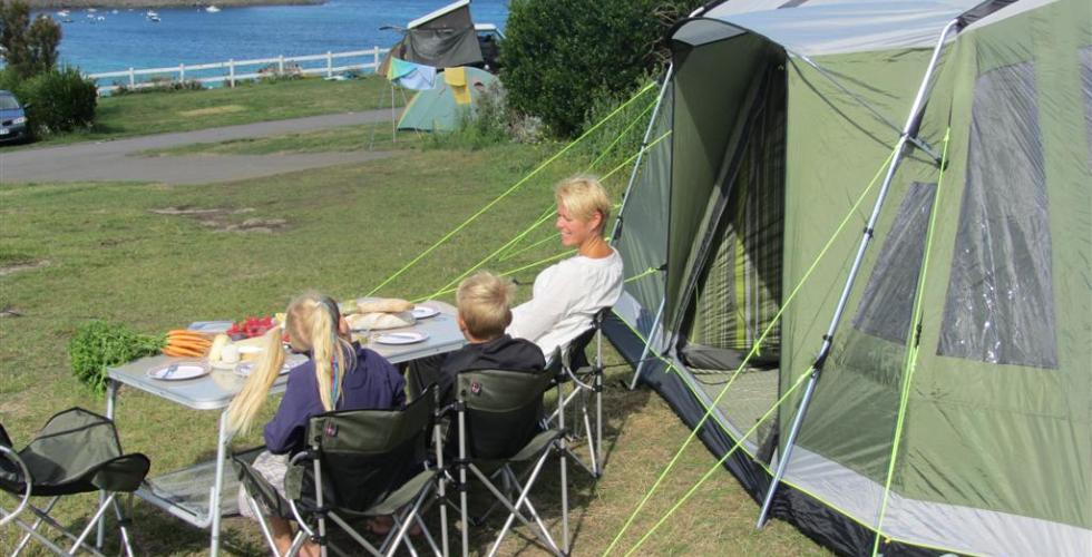 Vi sjekker inn på campingplassen som heter Camping de la Baie, som ligger få kilometer fra Frankrikes vestligste punkt Pointe du Raz. Den er veldig enkel, men også svært hyggelig. Det er en liten butikk sammen med resepsjonen og i den gamle tidligere stallen er det dusj og toalett. Det er primitiv camping, men for oss er beliggenheten det viktigste. Lekeplassen består av noen husker.