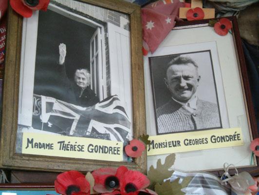 Med unntak av ganske få ting på kaféen får man verken filme eller ta bilder. Heller ikke til privat bruk, for stedet fungerer i dag like mye som en form for kapell, der krigsveteraner – de få, som er igjen og pårørende kan komme forbi og nyte en stille stund. Det er 6 små bord og man kan kjøpe kaffe og litt å bite i. Vi fikk lov til å ta et bilde av Madame Gondrées foreldre, som også under krigen drev kafé i huset. Under selve krigen kom mange tyske soldater til stedet. Hva de ikke visste, var, at Monsieur George Gondrée kunne tysk og på den måten hørte en masse, som han kunne fortelle videre til de allierte. Han drev kaféen med sitt eget og sine familiemedlemmers liv som innsats. De røde blomstene på bildet er valmuer. De symboliserer bloddråper og finnes overalt på kaféen.