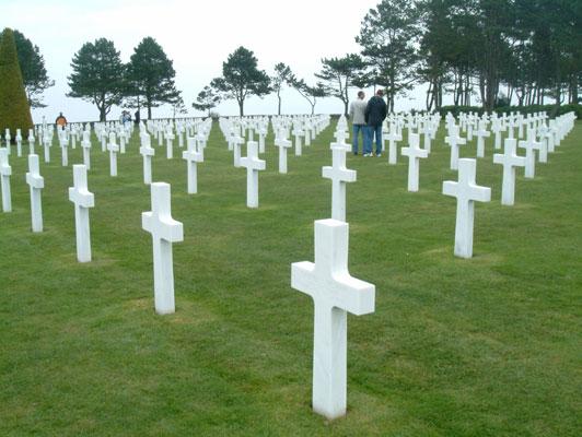 Amerikanerne har alltid evnet å gjøre noe stort og flott ut av hendelser, som vekker følelsene i oss. I Colleville-sur-Mer ligger kirkegården, Cimetiére St-Laurent, der 9386 amerikanere ligger begravet. Over 14.000 andre amerikanere ble transportert hjem til USA og sine etterlatte. Det, som fascinerer så voldsomt på kirkegården, er de 9386 hvite marmorkorsene, som står i like lange rekker, uansett hvor man ser dem fra. Minnesmerket på kirkegården er en 6,7 meter høy statue ”Spirit of American Youth” til ære for de mange unge soldater, som mistet livet under invasjonen og dagene etter. I ”De savnedes Hage” bak statuen er 1557 navn skrevet på en lang vegg av marmor. De ble enten ikke funnet eller var umulige å identifisere.