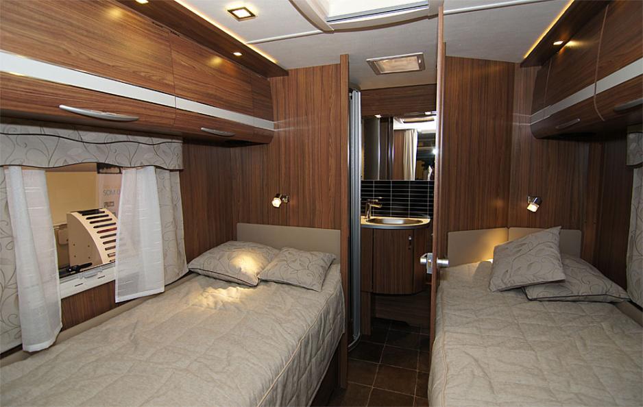Når man går inn i den 7,4 meter lange Polar Grizzly møtes man av varme toner der veggene i tre går sammen med smakfullt designede hvite luker, mens gulvet har mørkegrått flisemønster.I sovedelen finner man separate enkeltsenger, og lengst bak finner man badeværelset som strekker seg over hele bilens bredde.Kjøkkenet er vinkelformet med 4-bluss komfyr, og som tilvalg finns kjøl/frys-kombinasjonen Tec-Tower med innebygd gassovn.Lengst fram i bobilen finner man sittegruppen som består av to sofaer samt førerhusets deilige og vendbare stoler.I nedfellbar stilling gir sittegruppen sengeplass til ytterligere to personer.Flere vinduer, tre takluker og et panoramavindu gir herlig lys og luft til dette mobile hjemmet. Polar Grizzly kommer innledningsvis til å bli levert i en planløsning, men flere ventes innen kort tid.