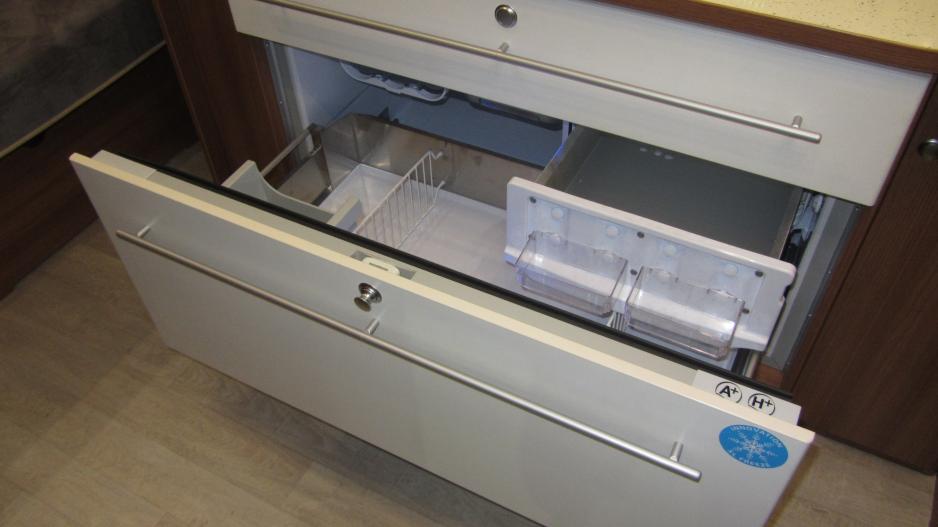 Franske Caravelair forbedrer hele tiden programmet og lanserte på messen den nok kanskje største nyheten. Et nytt kjøleskap, som er en skuff. Det er et kompressorskap, som kan drives på 220 V og 12 v, men behøver ikke gass.