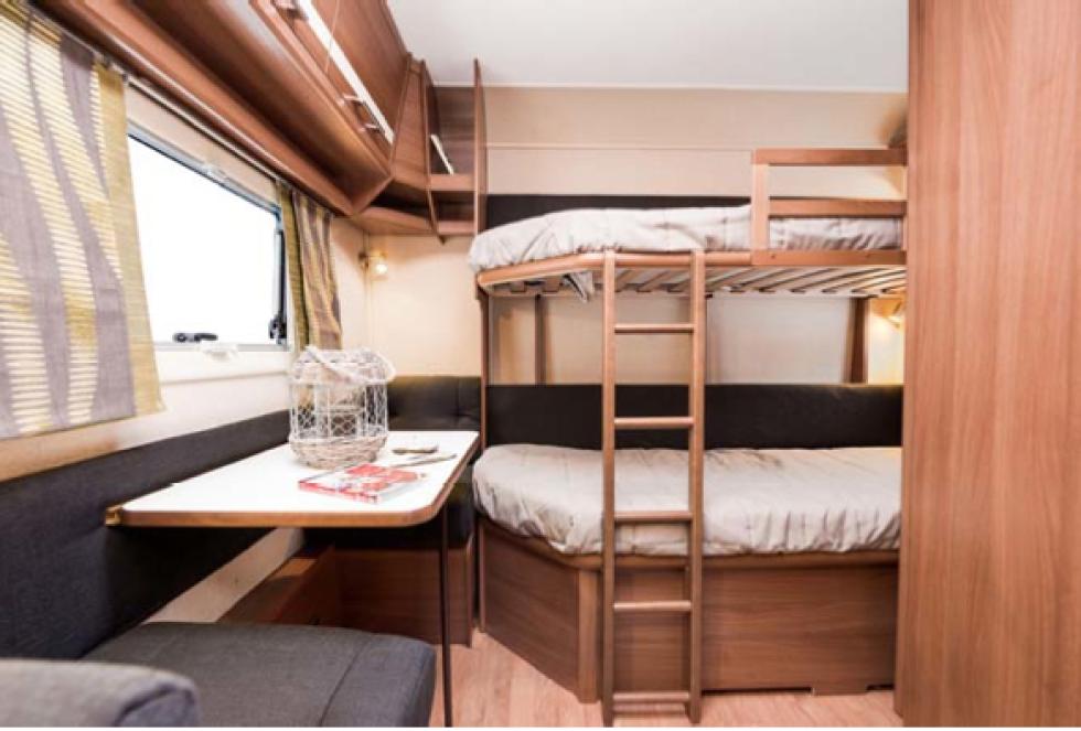 Classic 660 GDL kan bygges med enten to eller tre køyesenger lengst bak i vognen. Denne delen kan også stenges av med et forheng, og kan altså bli både fritids, kino og barnerom på en gang.Mulighet finns for eksempel til å montere en separat TV her bak.Oppbevaringsplassens størrelse og funksjon er alltid en viktig målestokk på en bra vogn. Har man med seg tre barn på eksempelvis vinterferie så er det kanskje det som avgjør et kjøp.– Ja, her blir det faktisk litt ekstra plass, framfor alt til garderober. I normale fall bygger denne vognstørrelsen på boggi‐chassis, sier Johan Skogeryd, salgssjef på Kabe.– Det gjør også at vi kan krympe prislappen ytterligere, uten å tulle med Kabes klassiske verdier.– Vi har fått plass til fire garderober, noe som vi er veldig fornøyd med, i tillegg til all annen smart oppbevaring så klart, sier Johan, og fortsetter.– Det som ikke har fått plass er dusjkabinettet, men jeg synes at dette er et veldig bra alternativ for barnefamilien som vil gjøre et trygt kjøp.