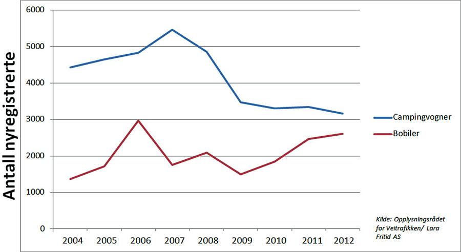 Salgsstatistikken for hele 2012 viser at antall nyregistrerte campingvogner går noe ned, mens antall bobiler går opp.