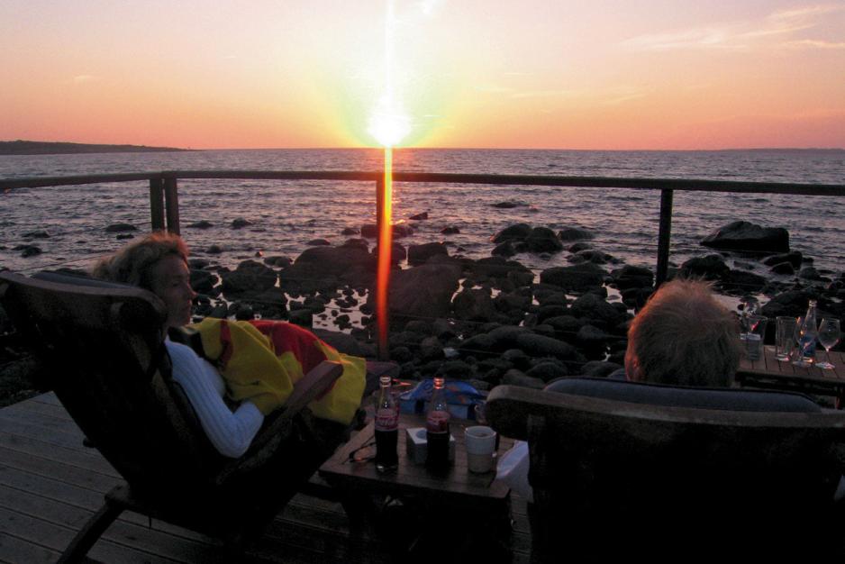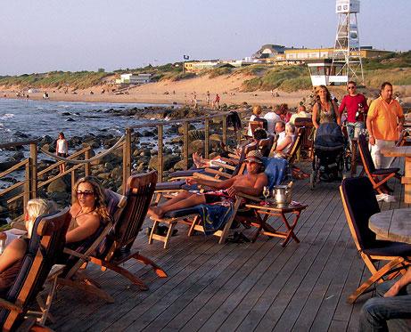 – Nordmenn har ikke samme tradisjon for livemusikk. Det blir aldri det samme trøkket i Norge som det blir her i Sverige, hevder en svett Jonas Hakeröd, bassist og vokalist i bandet «Haaks». Johan og bandet hans har akkurat avsluttet en to timers livekonsert inne på Solgården, et lite utendørsamfi bare et steinkast fra stranden. Her har de spilt alt fra hard rock til svenske schlagermelodier , coverlåter som åpenbart har hatt en effekt på de fremmøtte. Den siste timen har publikumet, bestående av noen hundre mennesker i alle aldersgrupper , deltatt i et ellevilt, hoppende og dansende kor. En forestilling som overgår de fleste after-ski fester, men så er også Tylösand noe for seg, skal vi tro Jonas. – Vi reiser og spiller mange steder, men her i Halmstad blir det alltid fest. Spesielt i helgene er det enormt med strandliv, og det betyr ekstra mye mennesker på after-beachen. Det er avgjort et av de største høydepunktene i året for oss, smiler Jonas. Det skal vise seg at after-beachen bare er en forsmak. Etter at solkremen er dusjet av, og magen har fått middag og kanskje en drink eller to, dukker folkemengden opp igjen. I alle fall de som ikke har barn som skal passes. Nattklubben «Leifs Lounge» ved Tylösand hotel har over 100 meter kø allerede klokken ti, en gjeng solbrune skikkelser vi til stor del trekker kjensel på fra timene på stranden. At den varme sommernatten skal dyrkes ute ved havgapet, er det liten tvil om.