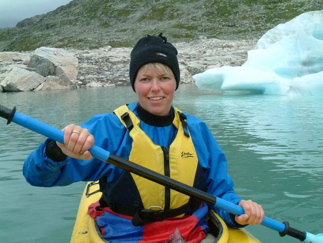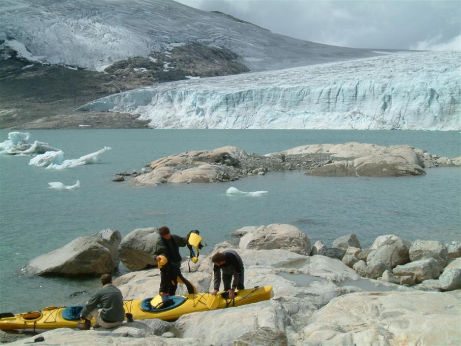 Vi skal være i Lærdal i en uke, og første kvelden går med til å skumlese alle de flotte brosjyrene. Det blir vanskelig å velge, men vi bestemmer oss for en tur til Nigaardsbreen som er en sidebre til Jostedalsbreen, som er Nordeuropas største isbre. På Breheimsenteret melder vi oss også på til en heldags kajakktur på Styggevatten, der vi skal helt opp til Austdalsbreen – en annen av Jostedalsbreens mange sidebreer.Andy, som er vår New Zealandske guide, får raskt gitt sine instrukser, og før vi vet ordet av det glir vi gjennom det vakreste turkisgrønne isbrevann. Lydløst og grasiøst skjærer kjølen seg gjennom det iskalde vannet. Vi padler bare 10 meter fra land for vannet holder bare en temperatur på to grader, og det svømmer man ikke langt i.