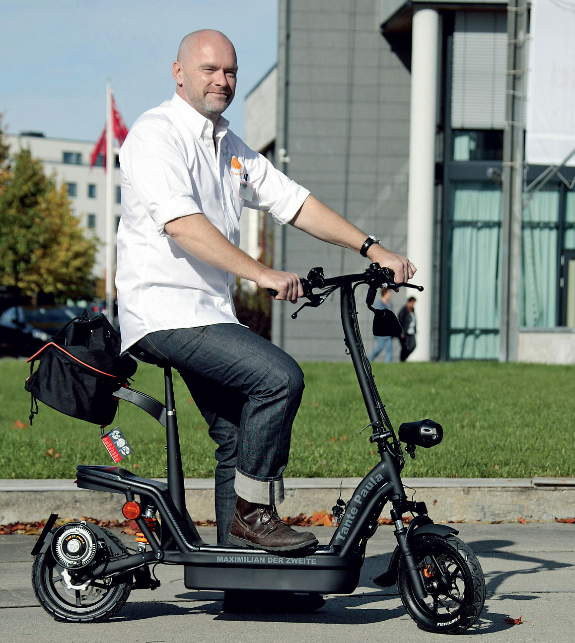 Du får den billigste modellen for 11.900 kroner og for under 15.000 kan du altså velge. Maximillian II er toppmodellen som har blant annet speedometer med 7 funksjoner, gasshåndtak med batteristatus (dumt å kjøre tom, ikke så lett å lade etter veien...), horn og lys, speil, stabile alu-felger med MC-dekk, skivebremser samt batteri i bæreveske med adapter for separat ladning eller ladning direkte i scooteren. Dessuten følger to setepinner i forskjellige høyder med. Den noe billigere Ferdinand II er i krom, mens Maximillian II er svart. Utstyret er omtrent det samme, men «Ferdinand II» er ikke like sterk som sin storebror.Electric Vehicle Oslo selger også elektriske biler, men se ikke bort fra at Tante Paula og elscooterne blir en bestselger ganske snart.