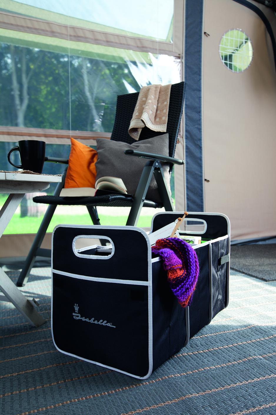Den andre nyheten fra Isabella er Flex Organizer, som du kan du henge opp i overliggeren eller takstangen i forteltet. Det gjøres lett med det smarte velcro-opphenget, montert på Organizeren. Flex Organizeren er framstilt i sort polyester og har ett stort rom, inndelt med en hylle, og nettlomme på hver side, noe som gjør den velegnet til oppbevaring av f.eks. kopper, spill, håndklær eller familiens sykkelhjelmer. Også Flex Organizeren kan brettes sammen til minimal størrelse, når den ikke er i bruk. Den måler: H58 x D24 x B30 cm i utslått tilstand.