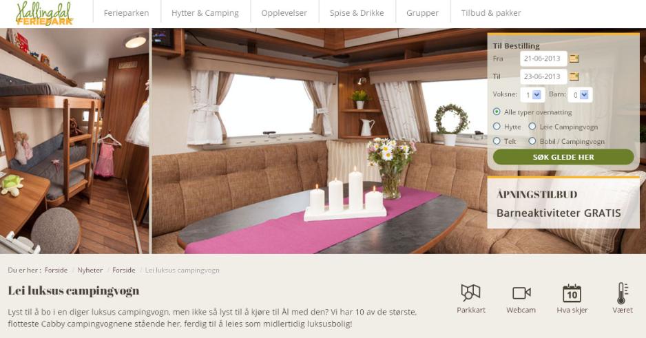 En av attraksjonene på Hallingdal Feriepark er å bo i luksuscampingvogner fra Cabby. Ti fullt utstyrte Cabby 800 F2C Caienna, med vinterisolerte fortelt til oppbevaring av ski og sykler, finns for utleie i ferieparken. Vognene har i tillegg til det omfattende standardutstyret også flatskjerm, kabel-TV og wifi.Hallingdal Feriepark samarbeider med danske Jambo Feriepark, som rangeres som en av Europas fem beste campingplasser. Jambos gjester har helt fra 2012 kunnet leie Cabbyvogner i ferieparken, og Jambo har medvirket i utviklingen av nye Hallingdal Feriepark.- Disse anleggene ligger i den absolutte Europatoppen, der konkurransen blir stadig hardere. De velger bare det beste og når de tilbyr sina gjester å bo i Cabbyvogner så er det også den høyeste anerkjennelsen for oss, sier Hans Lindh, direktør på Cabby Caravan AB.