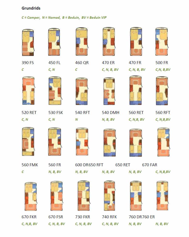 Det finnes 17 grunnriss i Beduin‐serien til modellåret 2014 – 14 av disse kan også fås som Beduin VIP. Deriblant finner man også de nye grunnrissene, som ble presentert under Camper og Nomad, imidlertid kan 520 RET ikke fås som verken Beduin eller Beduin VIP. Navnet Beduin VIP sier alt. Flotte tekstiler, skinninteriør og komfortutstyr som standard tilfredsstiller de høyeste krav til plass, stil og luksus. Også i 2014 omgis Beduin VIP av en eksklusiv flair. Den mørke møbeldekoren Edelakazie kombinert med det lyse, cremefargede bomiljøet i ekte skinn og bomiljøet Bengasi gir interiøret en nærmest yacht‐lignende look.