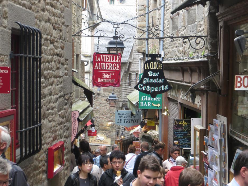 Det er ALLTID mange turister på Le Mont St. Michel og de smale gatene er ganske uframkommelige, akkurat som alt med hjul heller ikke egner seg på Le Mont St. Michels gater. Vil du få det hele litt på avstand så søk mot toppen eller sett deg på en av de små restaurantene på yttersiden av byen, der det er utsikt mot fastlandet og havet. Det er veldig vakkert når vannet har trukket seg langt tilbake.