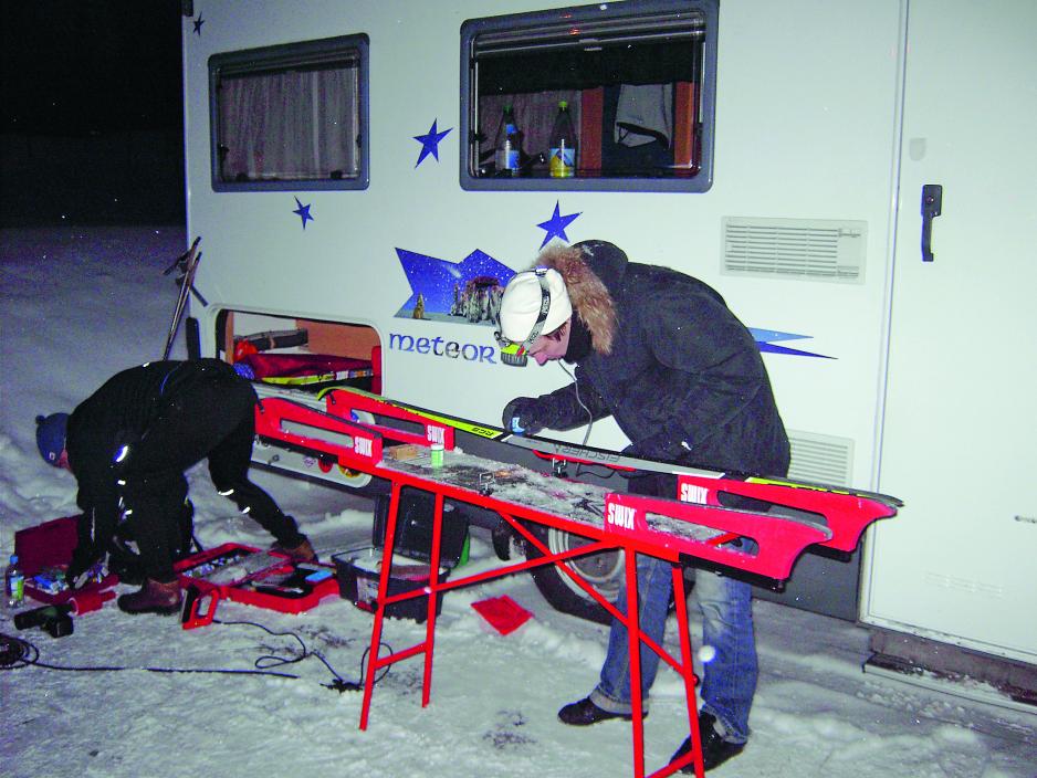 I en bobil er det også god plass til ski og smøreutstyr. Hver av gutta har med seg to-tre par ski. Ofte har de ett par til selve løpet, og andre til oppvarmingen. Skiene må legges frem tidlig om morgenen for å få en god plassering ved starten, og da må man varme opp med et annet skipar. De har ofte også konkurranseski til kaldt føre og et annet par dersom det blir mildere.Det er mange som benytter seg av bobil på slike arrangement og det sosiale er viktig når man i fellesskap med andre skiløpere smører ski og planlegger rennet neste dag. Når det gjelder å smøre skiene før renn, er det en rangordning blant gutta. Den dårligste løperen, som starter i det bakerste feltet ved start, er den som må smøre skiene sine sist om kvelden. Da har det ofte blitt mørkt.
