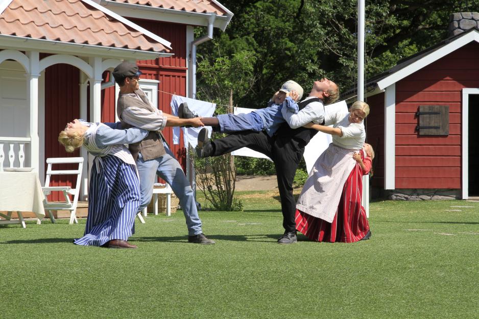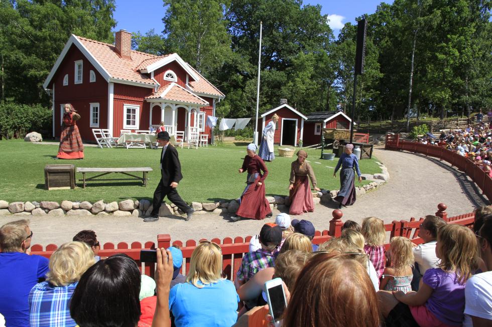 Etter et stort show på en stor scene med mange mennesker, er det behagelig å kunne ta en tur til en av de mindre plassene. Det er bygget opp et lite autentisk miljø til de fleste av Astrid Lindgrens figurer, og her er det mange skuespillere som gjør små oppsetninger til faste tidspunkter. Er du riktig heldig kan du i tillegg, som oss, treffe på for eksempel Madiken og Elisabeth med deres husholderske. I forkant av denne forestillingen var et par håndfuller publikum og skuespillerne samlet under et tre og lekte en ekte gammeldags mimelek. Fascinerende å se hvordan barn setter pris på voksne som vil leke. Litt senere på dagen traff vi på en tyv og to politikonstabler som ble fulgt av en liten tilhengerskare med barn. Og det var ikke rart, for det virket som om skuespillerne egentlig hadde pause, men likevel spilte sine rollefigurer og inkluderte publikum mens de spiste is og slappet av i varmen. En artig og autentisk opplevelse både for liten og stor. Det er nettopp slike litt tilfeldige men nære møter med mennesker som har et ekte engasjement som gjør denne parken helt unik.