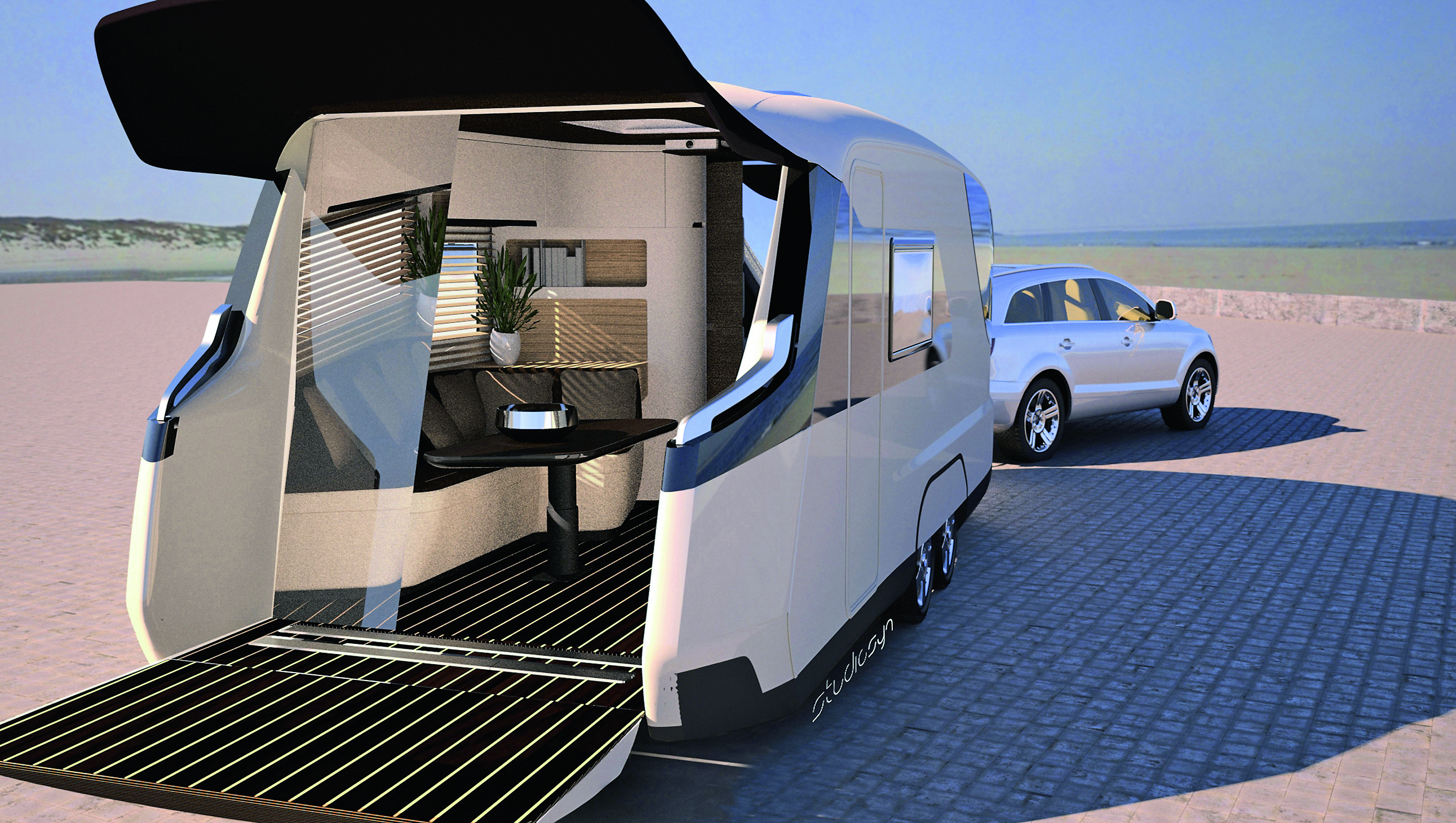 At stuen er unik og har mange funksjoner er ikke å overdrive, da endeveggen i campingvognen er en eneste stor dør og blir til en terrasse når du åpner den. Det gir en helt spesiell nærhet til naturen. Taket er dekket av et mørkt tekstil-stoff som gir rommet en spesiell atmosfære samtidig som det hjelper air-condition-systemet til å gjøre jobben sin.En HD-projektor er integrert i taket og projiserer bildet på glassdørene bak i vognen. Om ønskelig kan også bildet sendes andre veien og gjør det mulig å se på film eller bilder fra verandaen. Når bakdøren er slått opp er det gjort plass til to elektriske sykler som har eget uttak for strøm slik at batteriene alltid er toppladet.Soltaket i bakkant av vognen har fjernkontroll og kan fungere som et beskyttelsesdeksel.
