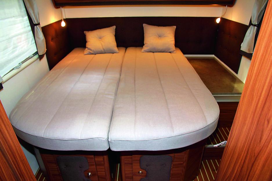 Den franske produsenten Itineo, som hører til Rapido-gruppen, har nemlig utviklet en soveløsning hvor to 75cm brede senger kan settes sammen til en dobbeltseng, de kan plasseres som to frittstående enkeltsenger med plass i midten, eller dobbeltsengen kan skyves til en av de to sidene.Sengene henger på skinner og har fire små hjul i fotenden. De oppleves som stødige og solide. Du løfter de noe i enden - og så kan de fritt skyves sideveis i hele bredderetningen.Det er nå fem Itineo-forhandlere i Norge, og nettopp denne modellen vil bli vist på messen på Lillestrøm til høsten.