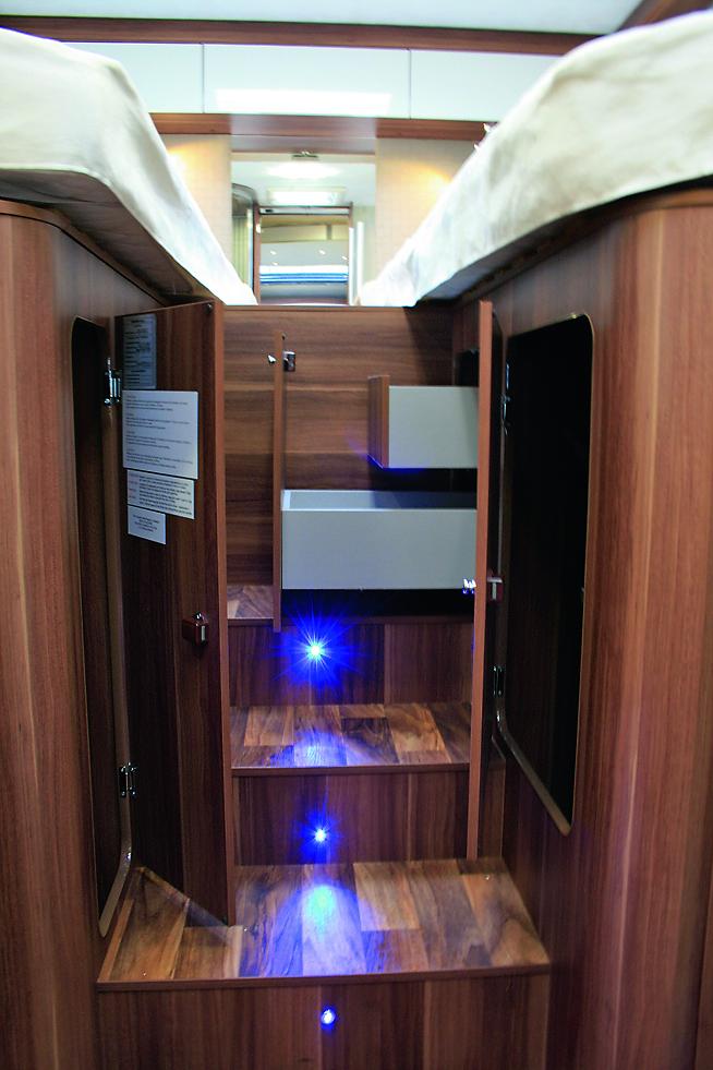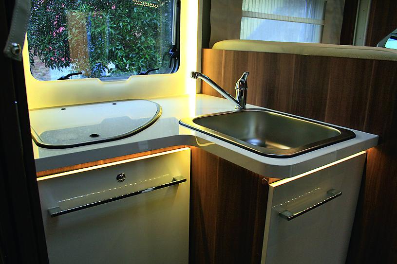 Dobbelsengen bak er senkbar slik at man kan justere størrelsen på garasjen under i forhold til hva man har med seg. Garasjen kan justeres helt opp til 1200 x 820mm og rommer fint sykkel eller scooter. Senkesengen foran er også hevet noe slik at ståhøyden under er 1,9 meter. Kjøkken og sittegruppe er ellers ganske lik Zafiro 284 TL.Med disse nye modellene fra RollerTeam håper italienerne å kapre nye kunder som er ute etter en innstegsmodell med mye standard utstyr til en god pris.