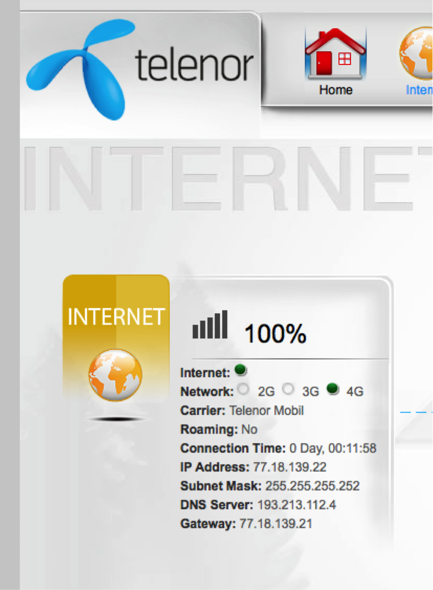 Operatører Netcom stort dataabonnement: https://netcom.no/privat/mobilt-bredband Telenor mellomstort dataabonnement: https://www.telenor.no/privat/mobiltbredband/ Tre.se data kontantkort: https://www.tre.se/Global/2014/Kundservice/Priser-Villkor/Översikt_3Kontant-Bredband_A4.pdf?epslanguage=sv Ice.no dataabonnement Norden (OBS kun i Norden): https://www.ice.no/private/mobile-broadband/ og deres samarbeidspartnere i Sverige http://www.net1.se og Danmark http://www.net1.dk Hvordan få norsk innhold i utlandet: http://www.dinside.no/914109/hola-unblocker-gir-deg-full-netflix-tilgang Data Kontantkort (Prepaid data) i utlandet http://prepaid-data-sim-card.wikia.com/wiki/Prepaid_SIM_with_data Antenne oppsetting- anbefaler ikke fastmontering http://smartprat.no/antenne-til-mobilt-bredband/