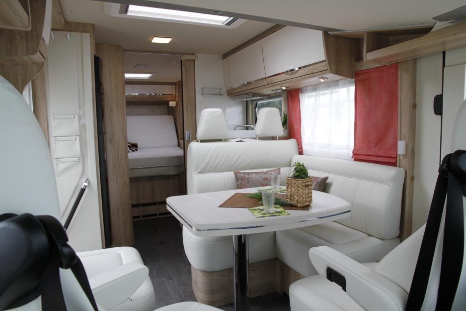 Sprendlingen, Tyskland: Det er en spesielt lys og trivelig modell jeg sitter i. Den 7,1 meter lange bobilen har som alle Eura Mobils bobiler dobbelt gulv. Sammenlignet med fjorårsmodellen IL720QB er det skjedd flere endringer: Lyset ved sittegruppen er plassert direkte på overskapet, slik at du ikke lenger skaller i det. Det er vesentlig bedre plass i kjøkkenbenken, da gasskassen ikke lenger er plassert her. Dobbeltsengen har elektrisk drevet hydraulisk heve- og senkefunksjon. Så du kan prioritere å ha med sykler i garasjen (opp til 125 cm), eller en lavere seng (20 cm).