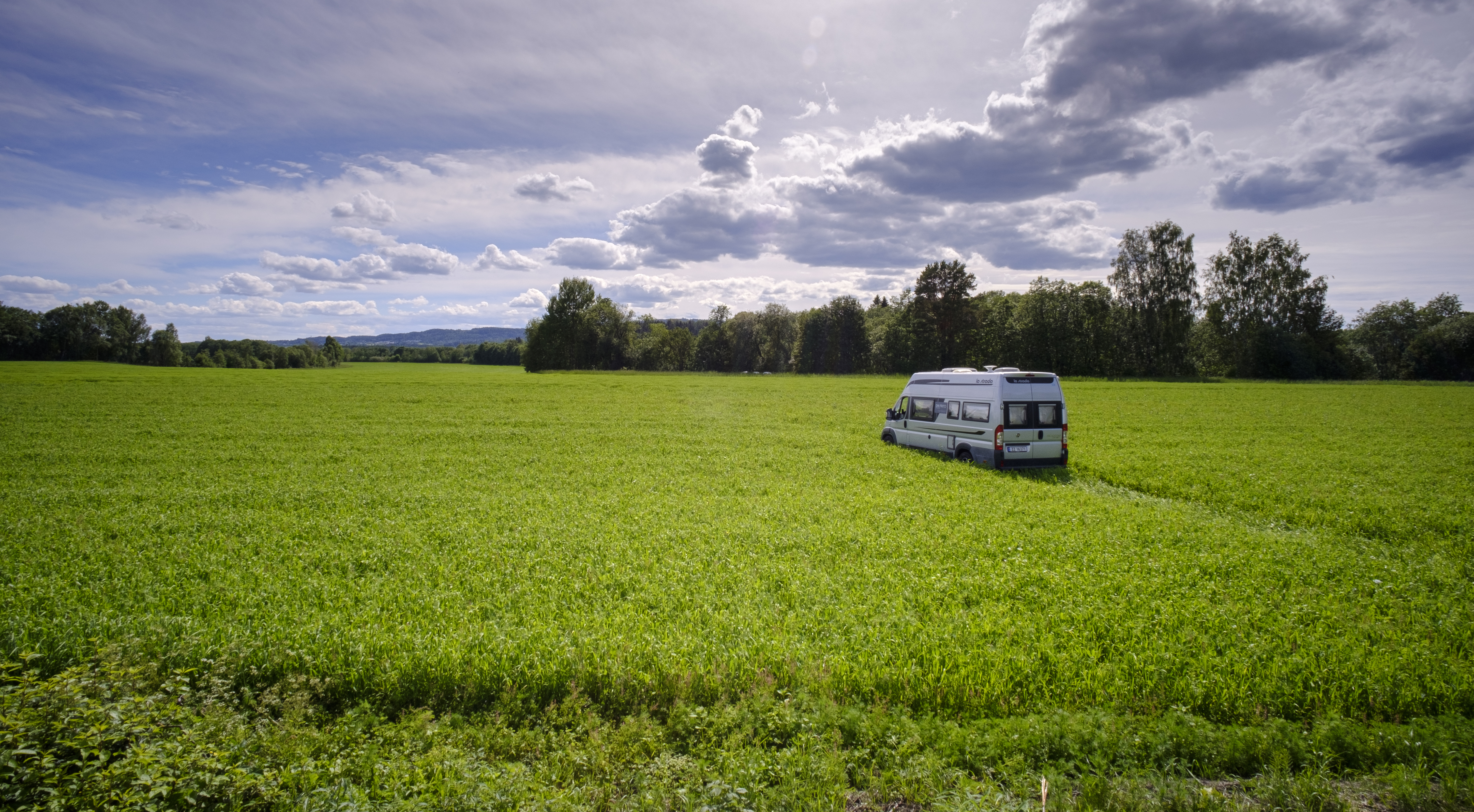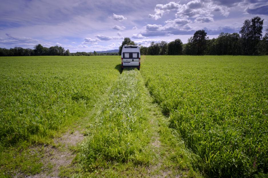 Underlaget kjennes fast og trygt ut og Din Fritids medarbeider og bobilen kommer trygt ut på jordet - og tilbake til veien, på området som om noen måneder skal forvandles til en bobilcamp med 5-600 vogner og bobiler.