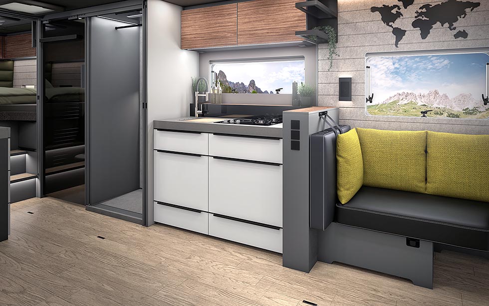 Dette Liner-utstyret gir maksimal selvforsyning, noe som gjenspeiles i det elektriske anlegget, standardutstyrt med litium-påbyggsbatteri som kan utvides opp til 450 Ah. I tillegg inntil 660 watt solcellemoduler med MPPT-regulator, 3 000 watt vekselstrømretter og et ladeapparat på 100 A.