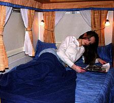 Dobbeltsengen på langs bak (190 x 118/95), har litt snaue mål i likhet med de fleste andre senger plassert slik. Madrassen på 12 cm ligger rett på finerplater, her burde det vært noe ventilasjon. I fotenden av sengen er det et rom for elektroinstallasjonen og ved siden av denne ligger spillvannstanken for vasken på badet. Videre har soveværelse to vinduer og tre lamper. Alkovesengen måler 215 x 125 cm og har en 7 cm madrass som ligger på fjærende plastelementer fra Froli. Tatt i betraktning at sengen kan benyttes av lange personer ville litt mer takhøyde vært av det gode. Fri høyde over madrassen er 55 cm og det er noe under gjennomsnittet. På varme sommerdager hadde en takluke (istedenfor takventilen) gjort nytte i tillegg til vinduet i alkoven. Av utstyr for øvrig er det to lamper, behagelig stige og forheng. Garderobeskapet måler 59 x 40 cm og høyden er 196 cm. Fra skapet er det tilgang til baksiden av Aldekjelen.