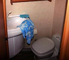 Toalettrommet (132 x 101/ 58 x h 199cm) er utført enkelt og greit med baderomstapet på veggene og vinylbelegg på gulvet. Toalettskapet er montert på bakveggen og dørene har ikke dørlåser. Ved en bråbrems kan dørene åpne seg og skapet tømme seg. En hylle i skapet hadde vært nyttig og dessuten kunne det kanskje vært bygget i rommets fulle bredde. Dusjen er ekstrautstyr og må vel kalles en nøddusj. Den er ikke adskillt fra resten av rommet, men gulvet har fall mot sluket i dusjen. Sluket går for øvrig i det fri under bilen. Ved gulvet i dusjen er det en radiator. Denne er på oversiden dekket av en finerplate som skråner ut av dusjen og slutter bak toalettet. Videre er det en håndkletørker hvor røret kommer ut fra rommet bak der Aldepannen står. Både her og langs slangen på hånddusjen kan vannet renne gjennom veggen. Dusjforhenget bør derfor forlenges og føres langs ytterveggen slik at det dekker radiatoren, dessuten bør dusjslangen ha en tett gjennomføring. Ellers er rommet utstyrt med toalett av typen C200, vask, lampe og en takluke.