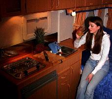 Kjøkkenbenken (118 x 48 x h 97 cm) har både skjærebrett og avlastningsbrett. I tillegg er det bare to bluss slik at det blir bra med arbeidsplass. Mens de dyrere modellene har tre bluss nedfelt med lokk har man her spart noen kroner ved å bruke kokebluss og oppvaskkum uten lokk slik vi kjenner fra tidligere. Benken inneholder kjøleskap (Elektrolux RM 4601L 97ltr.), to skuffer og to skap. Bilen har altså to spillvannstanker, en for vask på kjøkken og en for vask på bad. Den første er plassert i selve benken og tar opp mye av skapplassen. Det er to overskap, en med og en uten hylle. Avtrekksviften opptar noe av plassen. Videre finner vi to lamper og et vindu som er unødvendig lite.