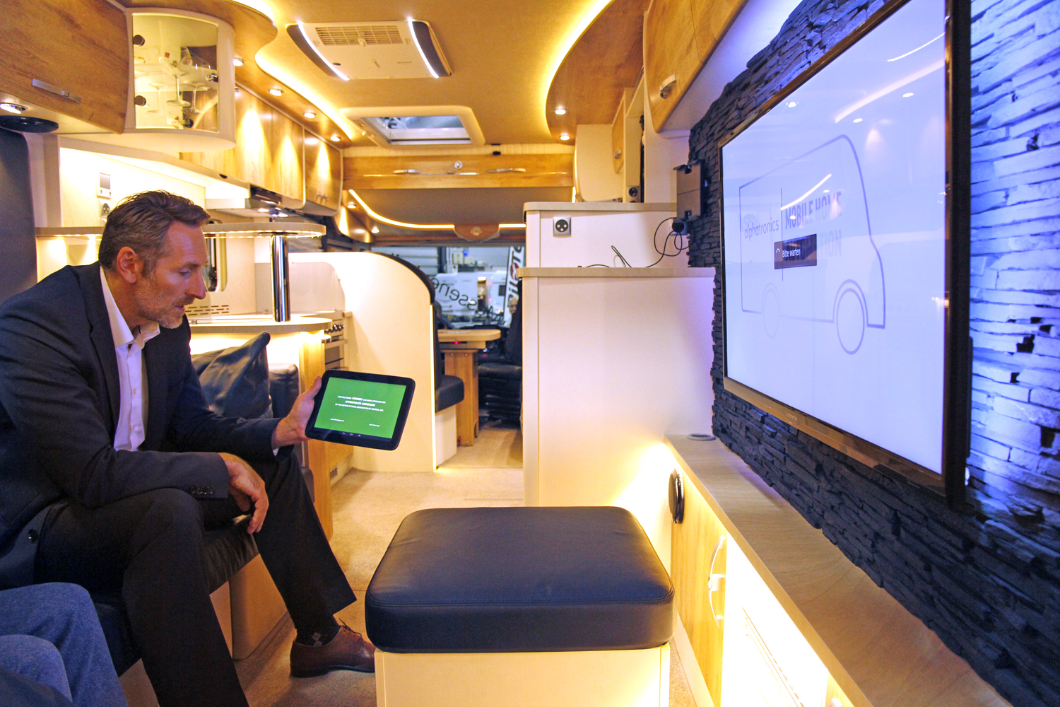 Men det er som sagt salongen og hjemmekinosystemet i denne bobilen som virkelig imponerer. Det er Alpine som leverer lydanlegget og senter for oppmerksomheten er markedets største 12V TV på 39 tommer. Alt styres elegant av et nettbrett, også trådløst om ønskelig. Det føles som om denne bobilen gir mobil moderne ferie nytt innhold! For det første kan du, som hos en del andre produsenter, styre lyset med nettbrettet. Lydanlegget fra Alpine er individuelt tilpasset, utprøvd og kalibrert for denne bobilen. Og her snakker vi om skikkelig trøkk fra de til sammen seks høyttalerne i tillegg til eget basselement! Styringsenheten fra Alphatronics kan også brukes på aircondition, varmen, lys, tv-kanaler og lyd - inkludert radio. I tillegg kan du selvsagt spille musikk på anlegget som ligger på det bærbare nettbrettet du kan ta med hjem i stua når du ikke er på tur.