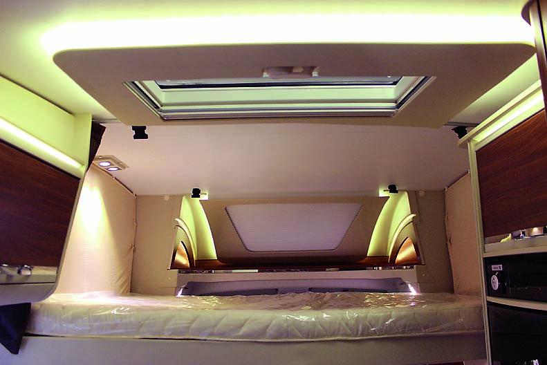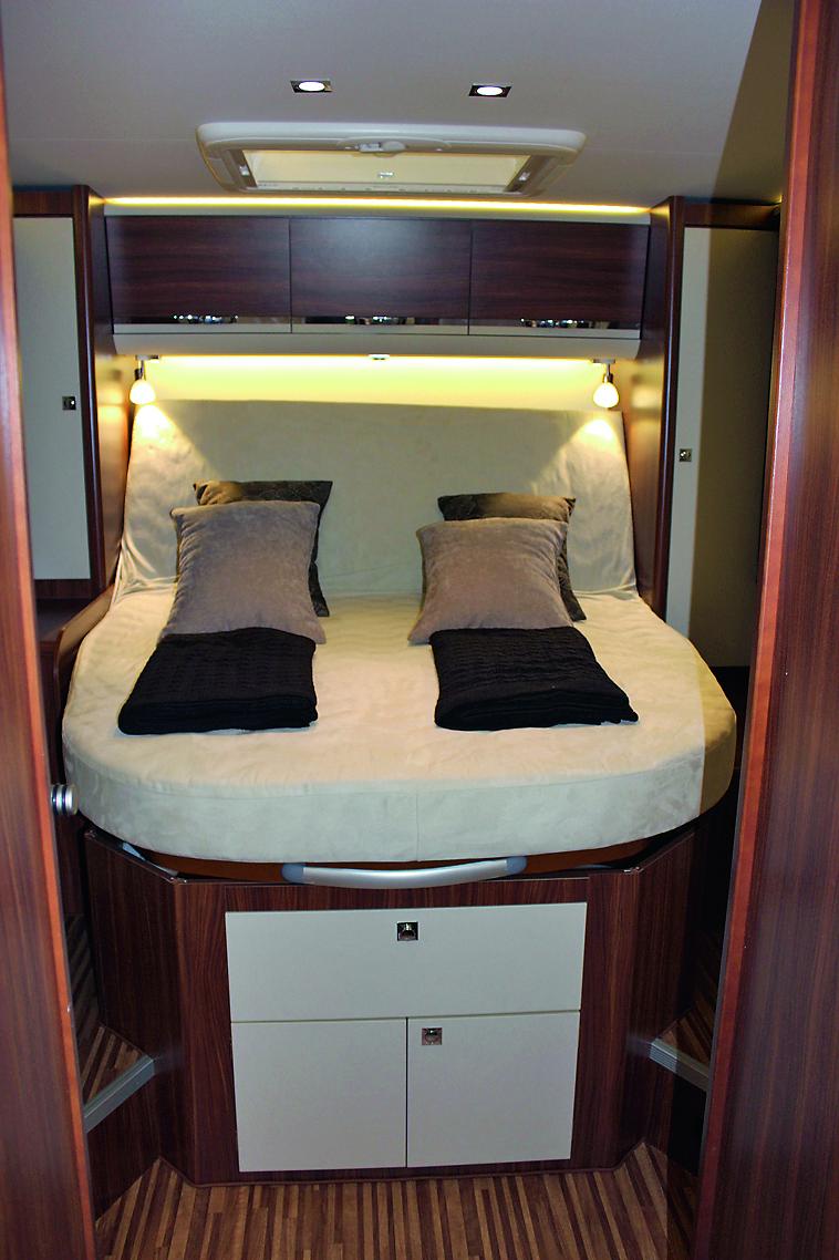 Den frittstående dobbeltsengen måler 191 x 144 cm med en 13 cm tykk madrass på fjærende treribber. Målene er det ikke noe å si på, denne typen seng har ofte lengde under 190 cm. Sengen er plassert lavt, det er 80 cm fra gulvet ved fotenden og opp til madrassen. Det er ett trinn opp på hver side, herfra er det bare 60 cm opp til sengen. Den lave sengen gjør garasjen under så lav at vanlige sykler ikke får plass. Hadde sengen kunne reguleres i høyden hadde man fått både i pose og sekk. Sengen kan skyves inn for mer gulvplass. Da reiser hodeenden seg for behagelig lesing på sengen. Under fotenden er det en stor skuff, pluss et skap. På hver side av sengen er det et klesskap. Med lav seng virker rommet luftig, mens to luftevinduer og stor takluke bidrar med mer luft. Diverse lysborder, to takspotter og to lesespotter gir lys etter behov. Senkesengen måler 126 x 186 og smalner litt av mot fotenden. Det er åtte centimeter madrass på fjærende treribber. Sengen senkes elektrisk, og som tidligere nevnt gikk det litt tregt på slutten til sikringen gikk. Da sikringen gikk var det 150 cm fra gulv og opp til madrassen og herfra opp til taket var det 63 cm. Det følger med stige for adkomst til sengen, lesespotter, videre sikkerhetsnett på hver side, men ikke takluke. Derimot er det et stort luftevindu i førerhuset rett foran, og takluke ved kjøkkenet rett bak. Ved bruk er det bare å ta av to nakkestøtter og kjøre sengen ned, greit nok.