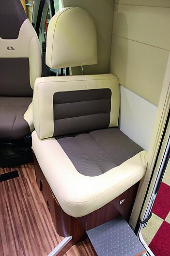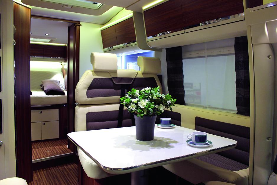 Sittegruppen består som vanlig av en L-sofa, sidesitter og to vendbare forstoler. En løsning som snart går igjen i alle bobiler. Putene er fint sydd med skinnbesetning. Det er god plass til fem personer og L-sofaen kan som vanlig gjøres om til et baksete for to med sikkerhetsbelter under kjøring. I tillegg kan sidesitteren gjøres om til sete mot fartsretningen og med hoftebelte. Dermed er det fem sitteplasser under kjøring. Det er og plass til to i oppredd sittegruppe, så de nødvendige fem sengeplassene er til stede for å få bilen registrert for fem. Bordet måler 86 x 75 cm, kan skyves i to retninger, dessuten senkes ved omgjøring til seng. Denne sengen er over to meter lang, men smalner av i fotenden til bredden på sidesitteren. God plass til en voksen, men nokså smal for to - for to barn er det tilstrekkelig. I sidesitteren er det el-komponenter som gjør den uegnet for oppbevaring. I baksetet ligger kombivarmeren, denne er av en eller annen grunn ikke tilgjengelig uten å skru fra hverandre sittebenken. Som ofte ellers mangler baksetet korsryggstøtte. Under kjøring over lengre strekninger er dette et problem, som selvfølgelig kan avhjelpes med noen løse puter. Men hvorfor kan ikke dette lages bedre fra fabrikkene? Fra stor takluke og stort takvindu kommer mye dagslys. Også belysningen ellers er bra. En lys, luftig sittegruppe.
