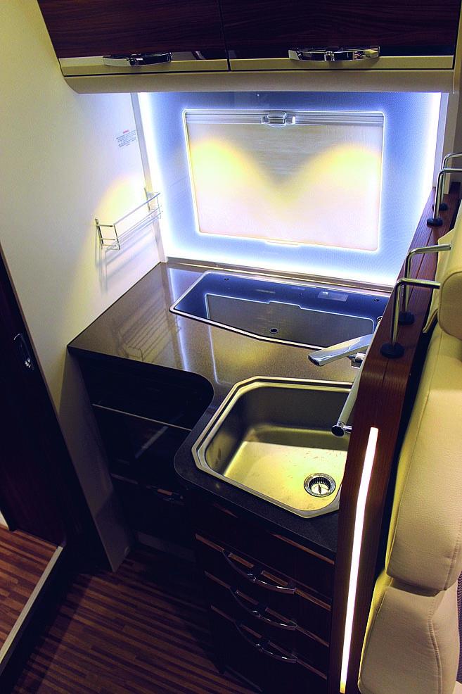 Kjøkkenbenken virker noe trang der den står inneklemt mellom dusjveggen og baksetet. Den måler 90 x 55/90 x h 96 cm, og går i vinkel. Oppvaskkummen er plassert til høyre og i bakkant mot vinduet, de tre blussene. Dermed er det litt arbeidsplass i forkant for kokken. I benken er det tre skuffer, et lite skap og stekeovn. Stekeovnen tar mye av plassen i benken og det blir igjen lite oppbevaringsplass. Også overskapet har begrenset volum, og det er ingen skap eller skuffer i nærheten som kan avhjelpe problemet. Bortsett fra dette er kjøkkenet fint utført med en opplyst glassplate på bakveggen rundt vinduet. Det er avtrekksvifte, luftevindu og takluke, samt god belysning. På motsatt side står kjøleskapet fra Dometic, et RMD 8505 på 160 liter brutto med 30 liter frys. Det har automatisk energivalg (AES).
