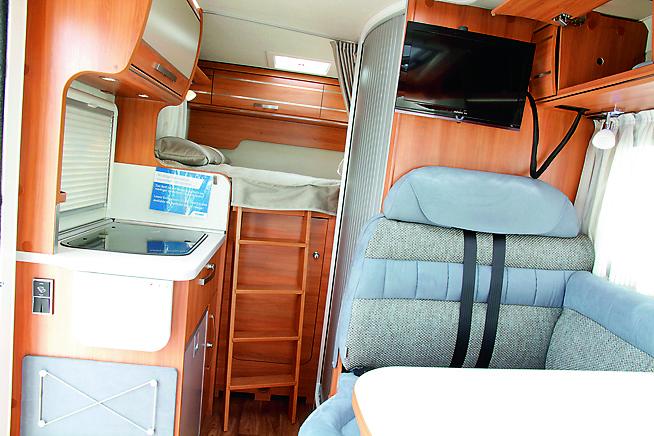 Bobilen er tenkt for to mennesker og har en tverrstilt dobbeltseng bakerst i bilen. Den delintegrerte modellen har en grei sittegruppe, spesielt når man har bilens begrensede lengde i bakhodet. Grunnen til dette er det kompakte badet. Her har Hymer laget et bad, hvor det er grei størrelse, men dusjen blir en nødløsning: På veggen i badet er det plassert et dusjhode, et forheng og et sluk i gulvet.