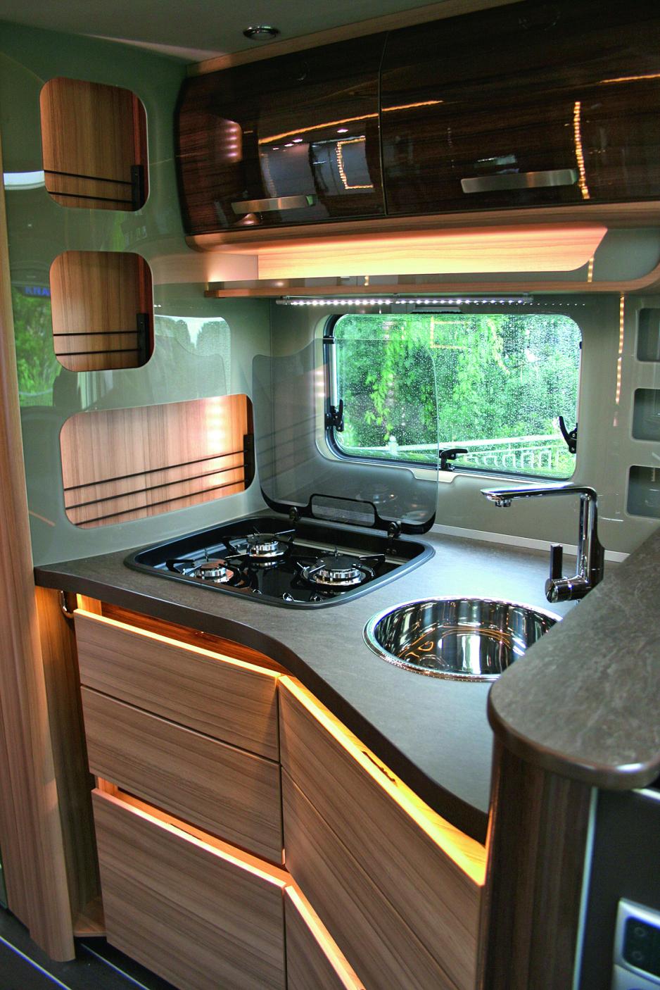 Utvendig har den en moderne front med helt nye frontlys som gir et elegant uttrykk. Lukene er utstyrt med en-hånds håndtak som gjør åpningen enklere. I luken til høyre for døren kan du som tilvalg få montert en egen skuff med en stor TV. Jeg kan godt se for meg at naboen din blir noe misunnelig når du benker deg foran skjermen og ser på Tour de France i skyggen under markisen, med noe kaldt i glasset. Bakparten er også ny med et maskulint uttrykk.