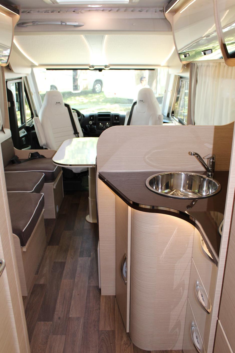 McLouis har i tillegg til modellene Glamys og Twid både en serie med halvintegrerte modeller under navnet MC4, hvor du finner hele 13 ulike planløsninger i tre forskjellige interiørutførelser, samt en helintegrert modell under navnet Nevis. Den sistnevnte er kanskje mest interessant for Norge og består av syv planløsninger, og også her kan du velge mellom tre ulike interiørkombinasjoner Gold, Diamond og Karat. Nevis 22 er registrert for seks personer og er 726 cm lang. Inngangsdøra er bak og her finner du også to køyesenger som kan justeres i høyden. Dette for en mer fleksibel garasje. Køyesengene måler 77x220 cm og har hvert sitt vindu. Badet har egen dusjnisje med foldedører og vindu. Speilskapet har skyvedør og toalettrullholderen er integrert i skapdøren. Kjøkkenet er av god størrelse med tre bluss og stålvask. Kjøleskapet er på 145 liter og fryser på 25 liter. Tre skuffer og et stort underskap gir god oppbevaring og effekt-belysningen under benken fungerer bra. Det som for øvrig imponerer mest i denne modellen er sittegruppa. Her kan du fint invitere mange av dine naboer over på kaffe for denne rommer 8-10 personer uten problemer. En sjeldent stor sittegruppe gir Nevis 22 en romfølelse du finner få andre steder. Senkesengen foran er fint integrert i taket og LED-belysningen er effektfull både over og under skap og i taket. Ved å re opp seng ved sittegruppen har du seks soveplasser i denne modellen som den norske importøren har stor tro på.